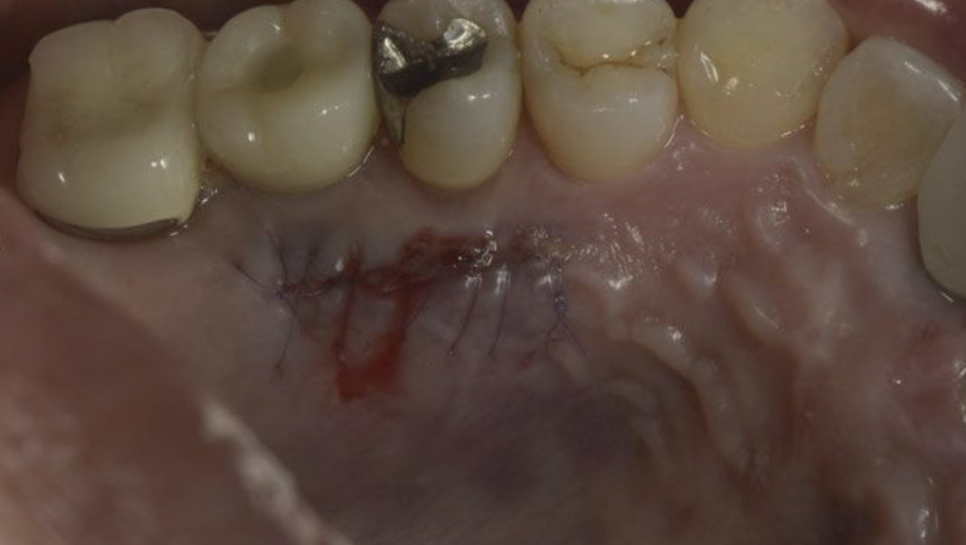 頬側は骨が足りない為、骨補填材を入れ、また失った歯茎(結合組織)も一緒に入れてボリュームを作ります。